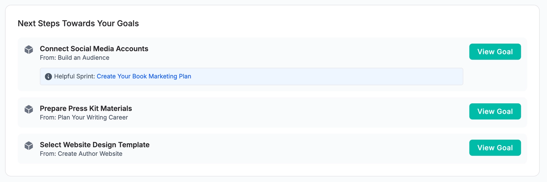 Every author’s path is different, so goals link to sprints and tools suited to each stage—whether building a debut or launching a new series.