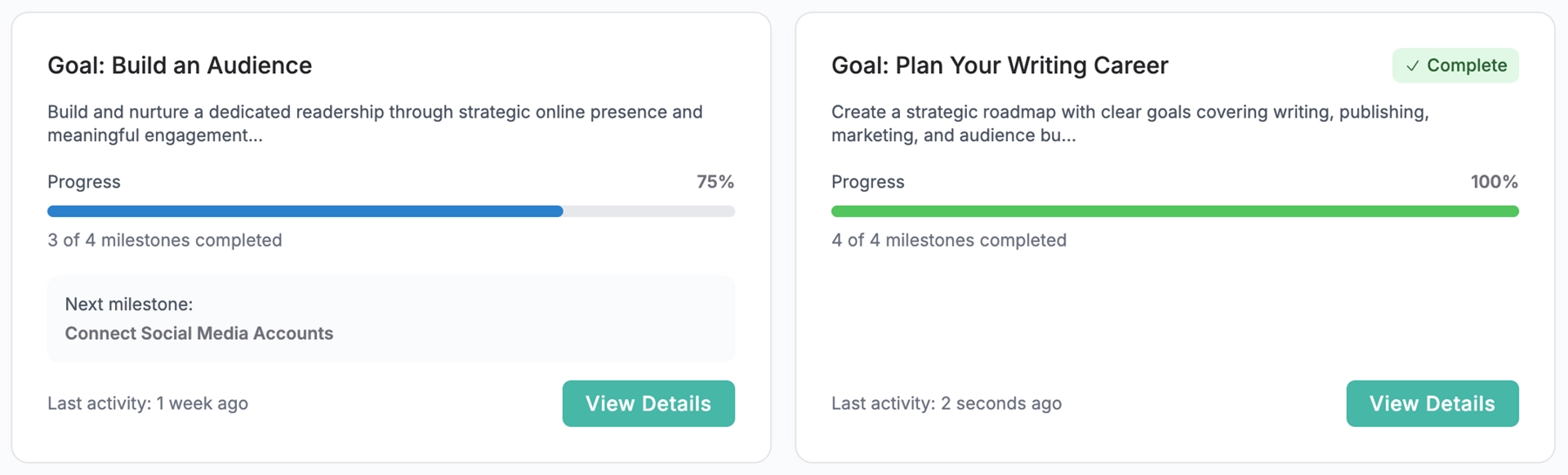 Goals are presented as milestones, each connected to practical tasks. Authors can see what’s finished, what’s next, and how every effort adds up to the larger picture.