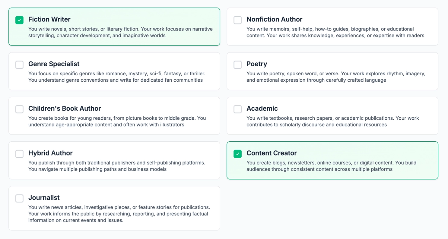 Cut through the noise of book marketing. Authors choose from structured goals that outline what to do and in what order, replacing uncertainty with steady, visible progress.