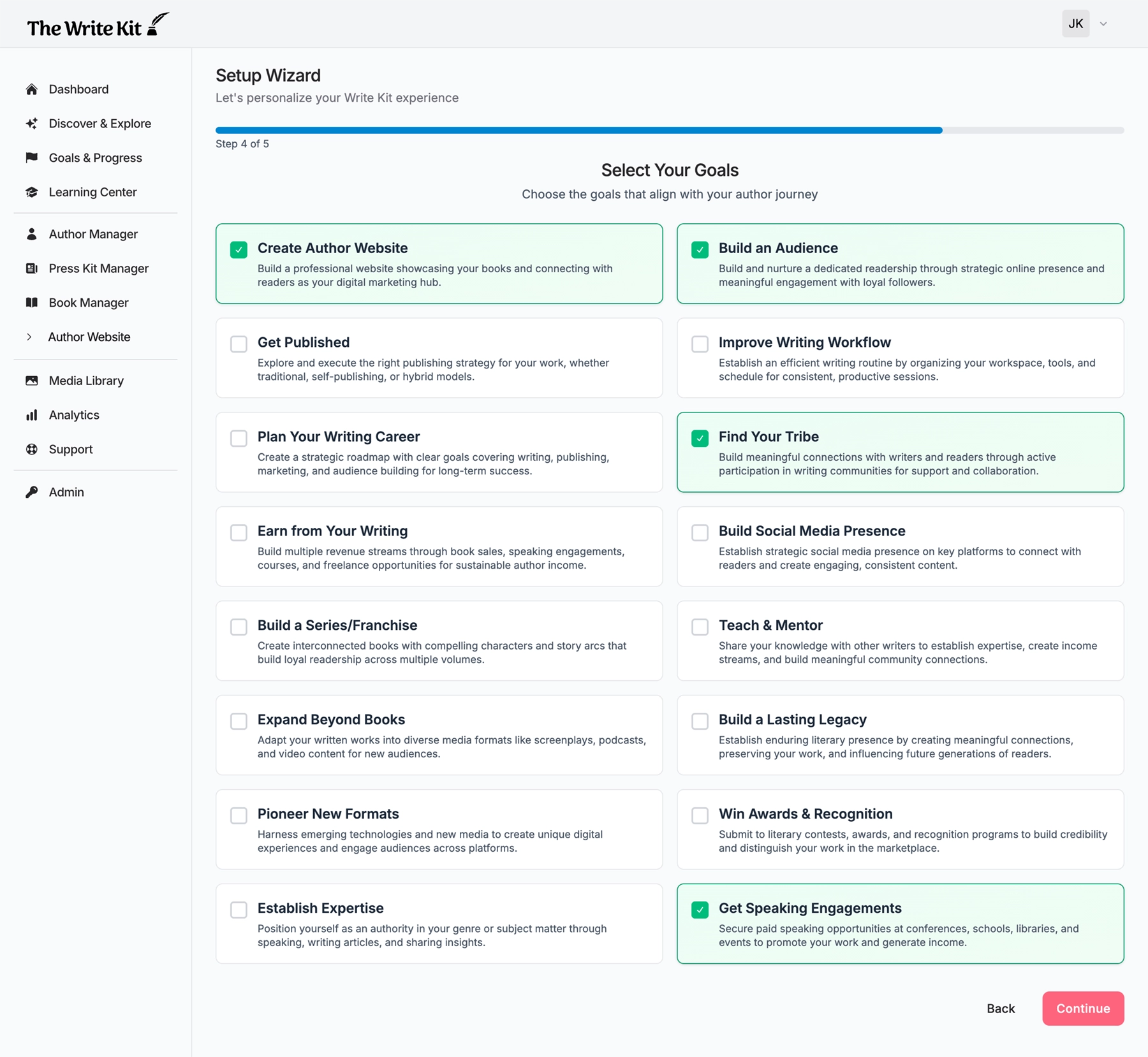 Each goal is broken into milestones that build momentum. For example, the Build an Audience goal guides authors through finding readers, choosing platforms, creating content, and growing connections.